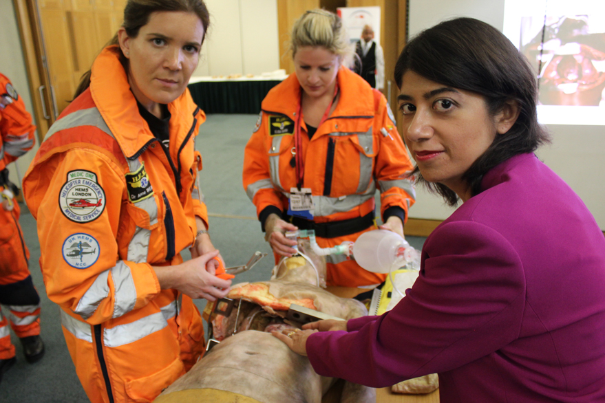Dr. Anne Weaver teaching MP Seema Malhotra of Feltham and Heston how to preform a thoracotomy (open chest surgery).